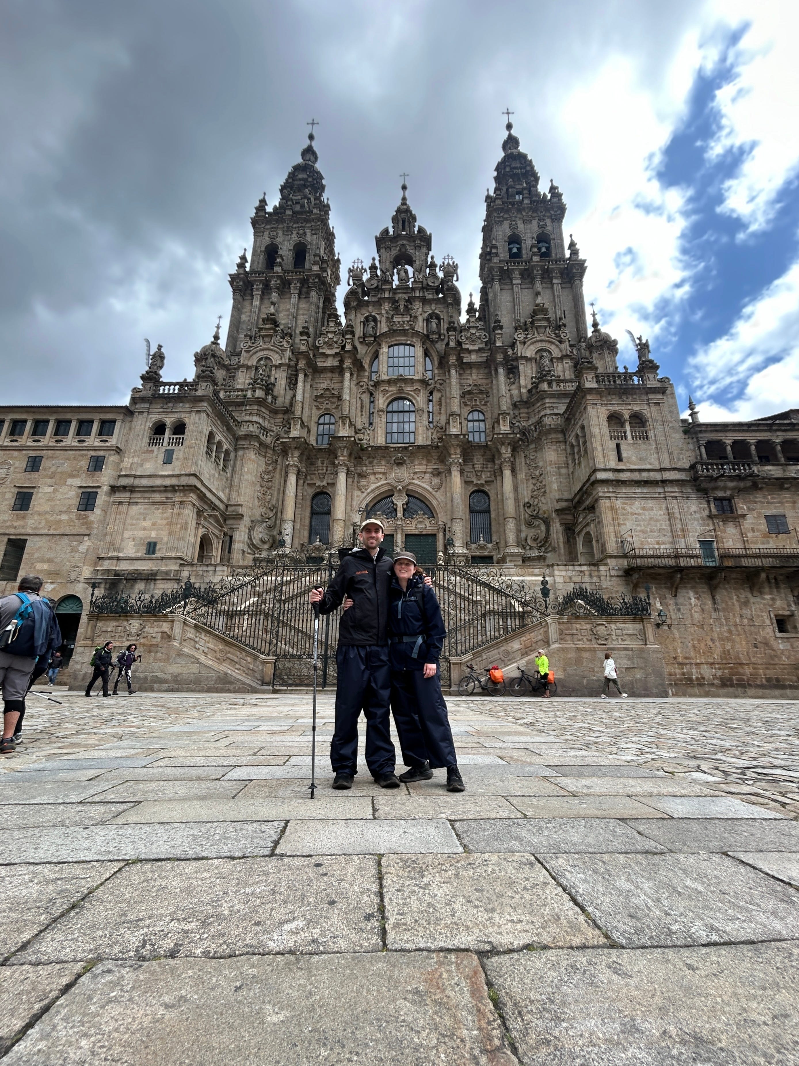 Today marked the final stretch of our Camino de Santiago journey, culminating in our arrival in Santiago de Compostela. We set out from O Pedrouzo with mixed emotions, knowing it was our last day of walking. Despite Ben's knee giving him a bit of trouble, we persevered, taking it slow and savoring every step. Nicky, aka the bag-carrying champion, once again proved her strength as she effortlessly toted our gear, prompting Ben's humble acknowledgment of her prowess. Along the way, we indulged in morning tea breaks and cheesecake pit stops, fortifying ourselves for the final leg. A brief rain shower tried to dampen our spirits, but our fancy rain pants saved the day. Arriving in Santiago, we reveled in the sense of accomplishment, basking in the familiarity of our hotel and the bustling atmosphere of the cathedral square. Despite a few aches and pains, we couldn't help but feel proud of our journey and eagerly looked forward to the next adventure, with Nicky already eyeing Barcelona as our next destination.