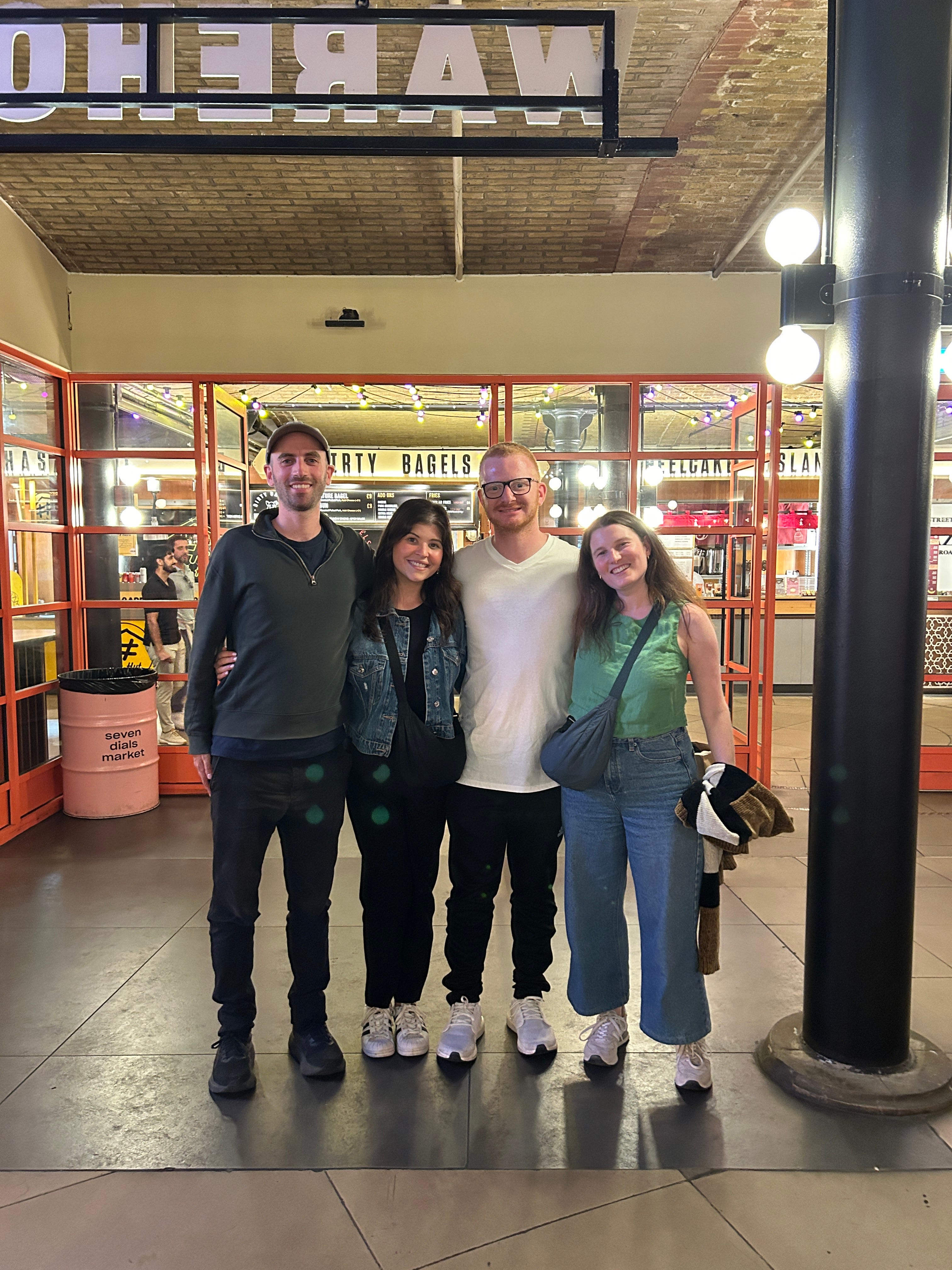 Our last full day in London started with a bit of divide-and-conquer. Ben had some work meetings (because who doesn’t love thinking about work on holiday?), while Nicky geeked out over brutalist architecture on a tour of the Barbican. We regrouped for lunch at Spitalfields Market, where Ben kept calling it “Spitalfield singular” for some reason, but the food was so good, we let it slide. Afterward, we squeezed in a coffee with Lauren, who managed to escape work for just long enough to join us. A quick power nap (Ben) and some solo wandering (Nicky) later, we were off for our farewell dinner with Dana, Ray, and Lauren at an Afghan restaurant. Emotional goodbyes followed, and we’re still not sure if it was the delicious food or the fact that Dana needed a helping hand around the streets with her injured ankle that got us all misty-eyed.
